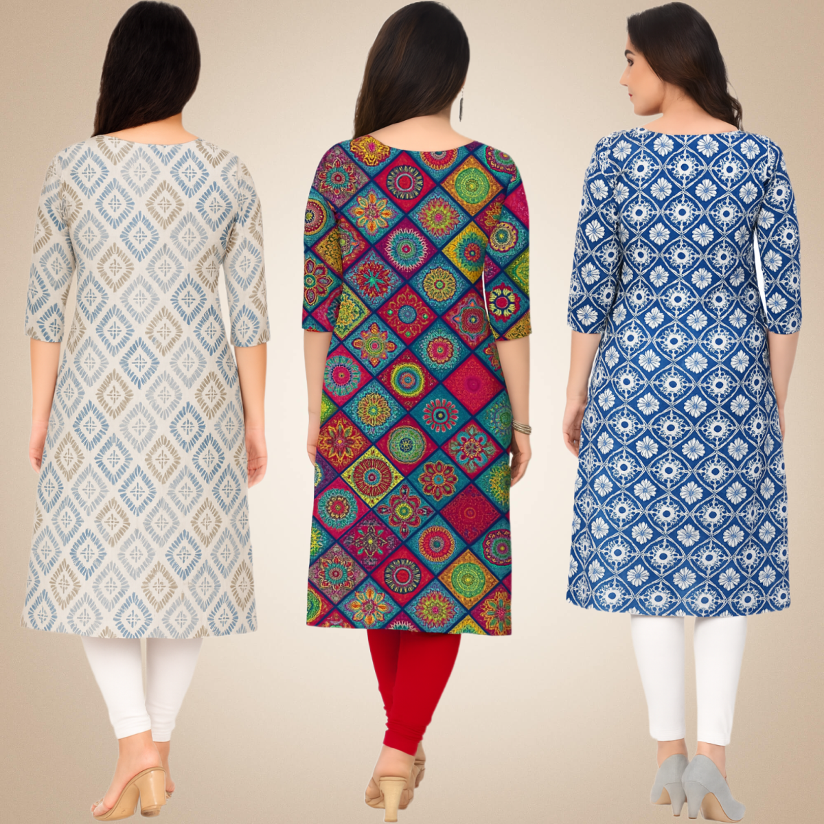Radiate vibrant energy with this spirited trio of Effervescent kurtis, crafted for those who celebrate dynamic personal style. Each kurta combines lively fabric selections with expert tailoring that creates a flattering fit while ensuring all-day comfort and confidence. The three complementary designs offer comprehensive styling flexibility, seamlessly transitioning from casual social gatherings to more refined occasions. These kurtis feature exceptional construction with reinforced stitching, quality thread work, and color-fast materials that preserve their luminous appearance through extended use. The lightweight, breathable composition adapts effortlessly to seasonal variations while maintaining comfort and elegance. This strategically assembled combo pack delivers remarkable versatility and outstanding value, making it an essential investment for your ethnic wear collection. Ideal for those seeking vibrant, durable pieces that combine contemporary energy with timeless sophistication and practical everyday functionality.