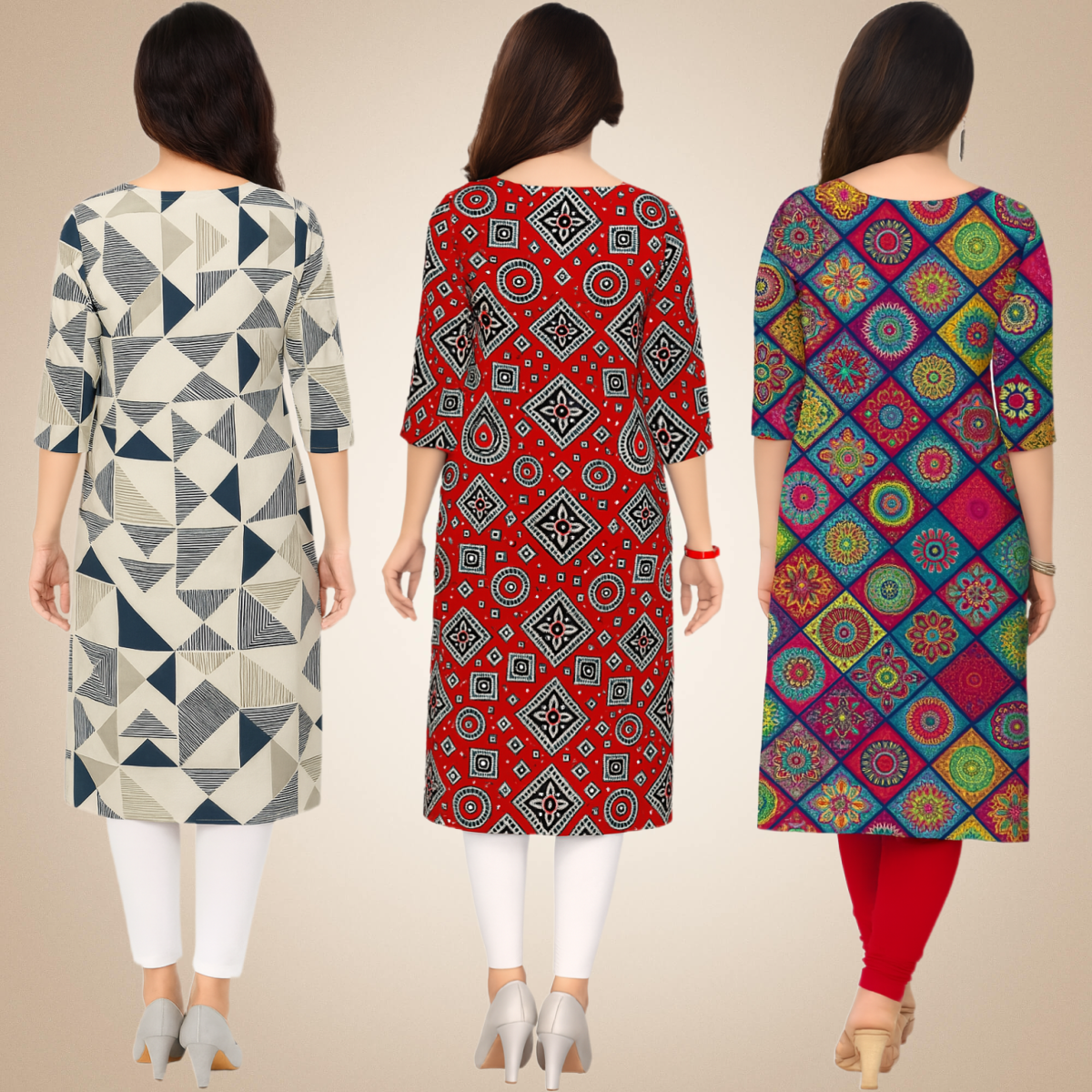 Transform your ethnic collection with this exceptional three-piece kurti ensemble that balances tradition with contemporary design sensibilities. Each kurti in this combo is thoughtfully selected to offer distinct styling possibilities, whether you're dressing for professional settings, social gatherings, or leisurely moments. The collection showcases refined craftsmanship with fabrics chosen for their comfort, breathability, and longevity. These kurtis work seamlessly with various bottoms and accessories, allowing you to create multiple outfits from a single purchase. Perfect for the discerning shopper who values both quality and versatility, this combo delivers substantial wardrobe expansion at exceptional value.