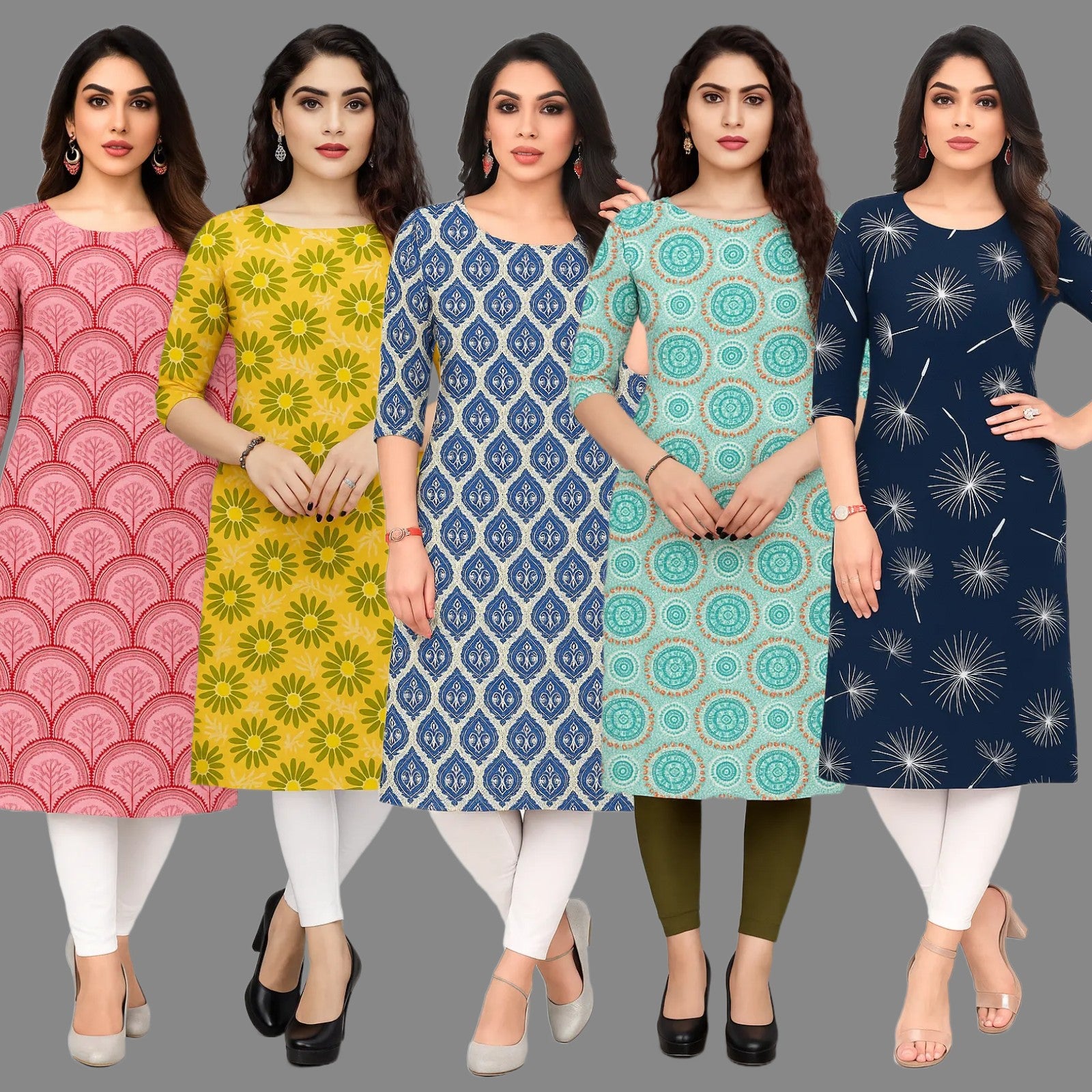 Elevate your wardrobe with this fabulous combo pack of five women's printed kurtis, crafted to merge style and comfort effortlessly for diverse occasions.